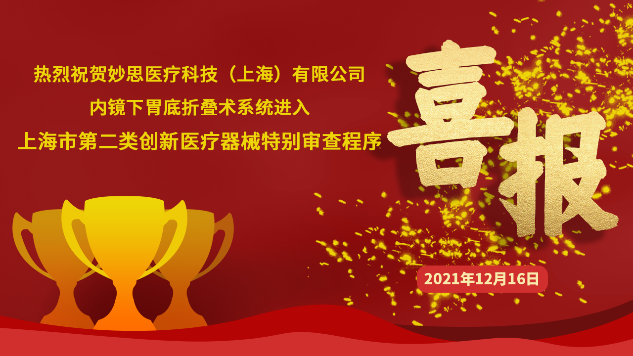 妙思医疗科技(上海)有限公司(简称“妙思医疗”或“公司”)于近日收到上海市药品监督管理局医疗器械技术审评中心下发的《上海市第二类创新医疗器械特别审查申请审查结果公示》(2021年第2号),确认公司产品“内镜下胃底折叠术系统”进入创新医疗器械特别审查程序。现将相关情况介绍如下: